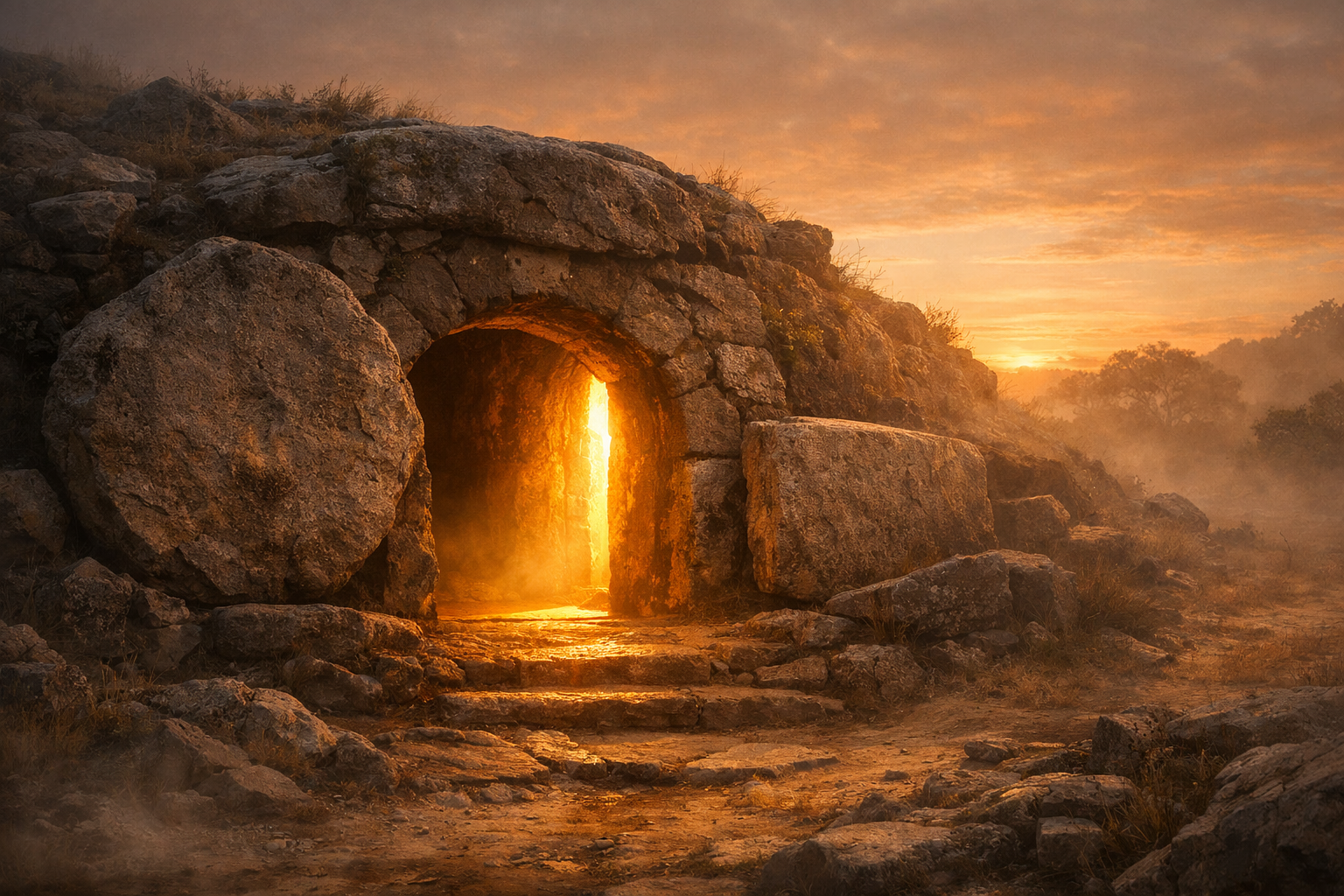Ancient stone tomb entrance at dawn, warm golden light breaking through the opening, early morning mist, earth tones, cinematic, no people, peaceful but powerful